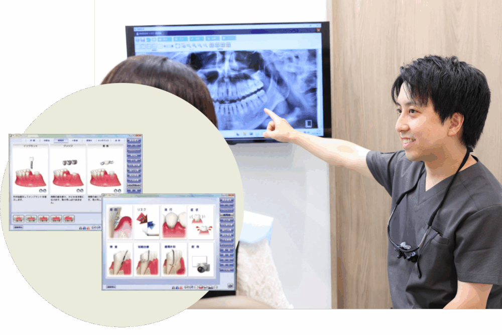 レントゲン画像や口腔内写真、3Dアニメーションなどを使って、「見てわかる説明」を大切にしています。 不安な気持ちやわからないことがあるまま治療が進むことのないよう、患者さま一人ひとりのお気持ちに寄り添いながら、やさしく丁寧にご案内していきます。「痛みが苦手」「何をされるのか不安」と感じている方も、どうぞ安心してご来院ください。