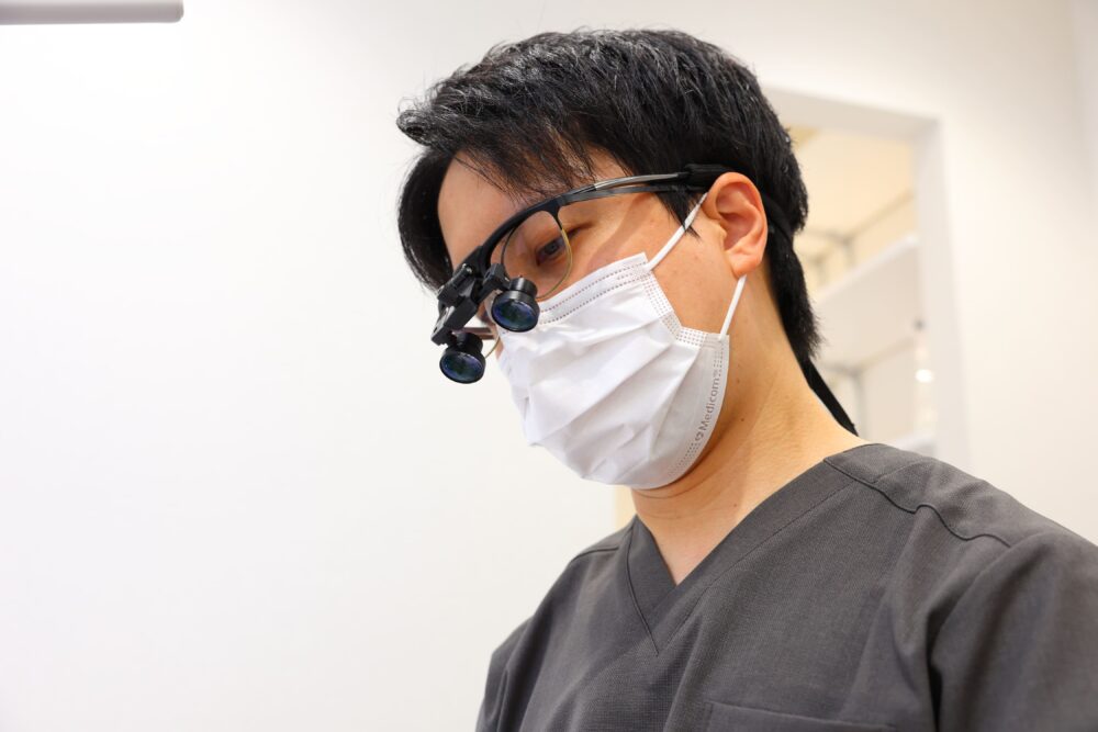 拡大鏡は、治療部位を肉眼の約6倍に拡大して確認できるルーペです。細かなむし歯の取り残しや、詰め物・被せ物の適合精度を高めることができ、治療の確実性が向上します。患者さまの大切な歯をできるだけ削らずに残すため、精密な治療に欠かせないツールです。