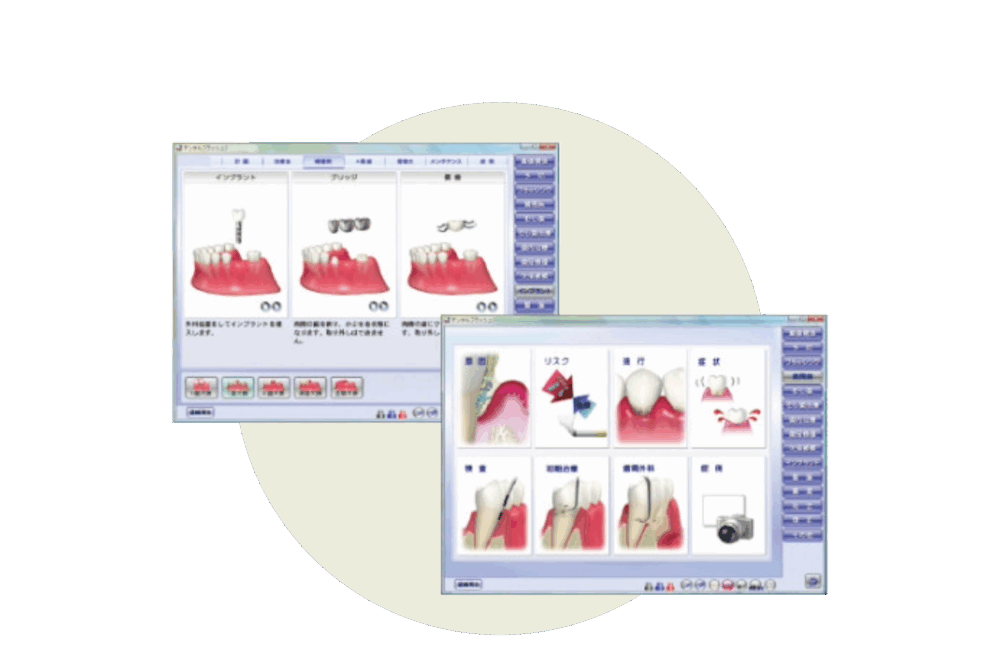 当院では、治療内容や検査の流れ、術後のケア、予防方法などをわかりやすくご説明するために、3Dアニメーションを用いた説明ソフト「デンタルフラッシュ」を導入しています。